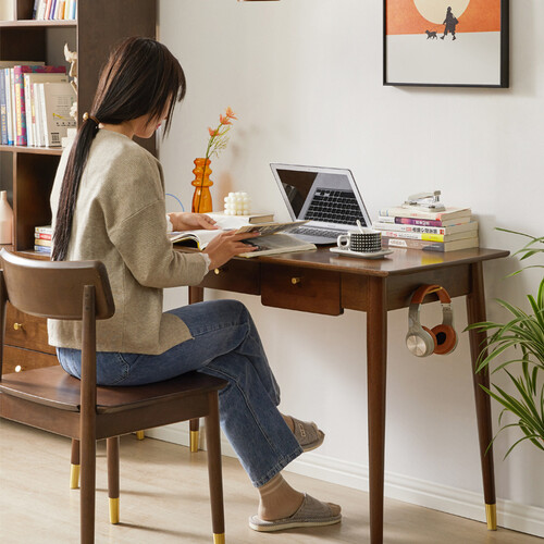 简约书桌,线条流畅收敛,选用进口橡胶木,光滑柔和,搭配质感黄铜金属,增添奢华感,通透高离地,宽敞自由。
