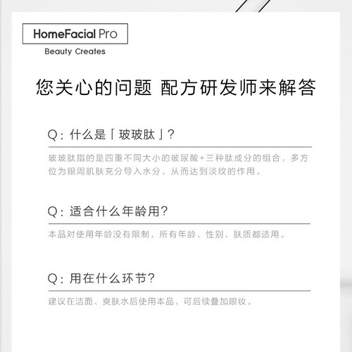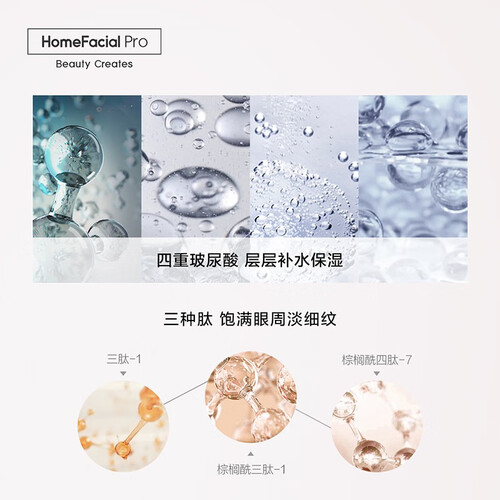 拥有三种肽成分组合,抚平受损的细纹,眼周饱满Q弹。采用四重玻尿酸成分,快速补水填平细纹,锁住弹润的少女眼。