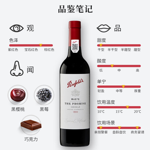 酒液呈诱人的宝石红,轻嗅可闻到浓郁的黑色浆果香,伴着雪松、檀香的味道。口感醇厚顺滑,带有巧克力的味道。