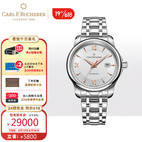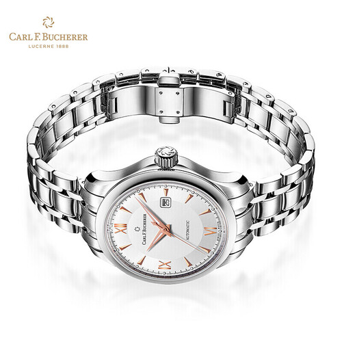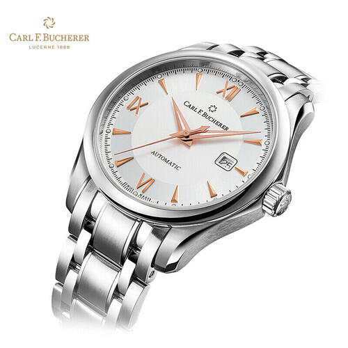 表壳及表带采用了自带光泽感的精钢材质,看上去质感满满。简洁利落的大三针及3时位置日期窗口的设计,表明这款腕表以功能为先。