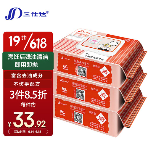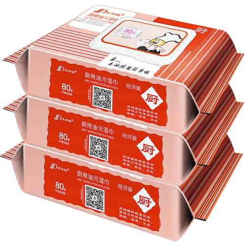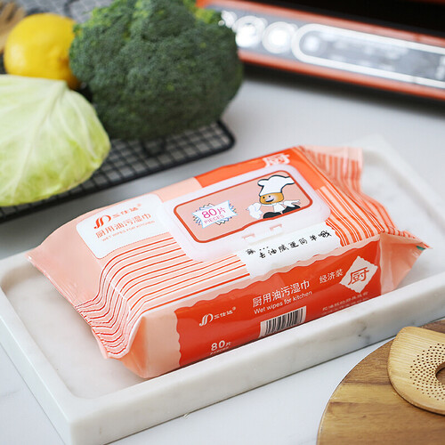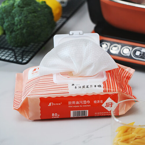 三仕达厨房湿巾含表面活性剂、苹果酸等多种去油污分子,能够有效擦出厨房油污,让厨房里的角角落落洁净如新。