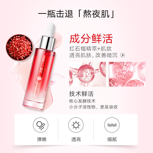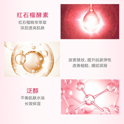 红石榴精粹结合肌肽,实力改善暗沉,肌肤更加红润透亮。搭配核心发酵技术,小分子更易于吸收,提升肌肤平滑度。