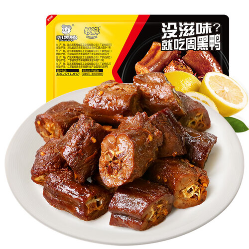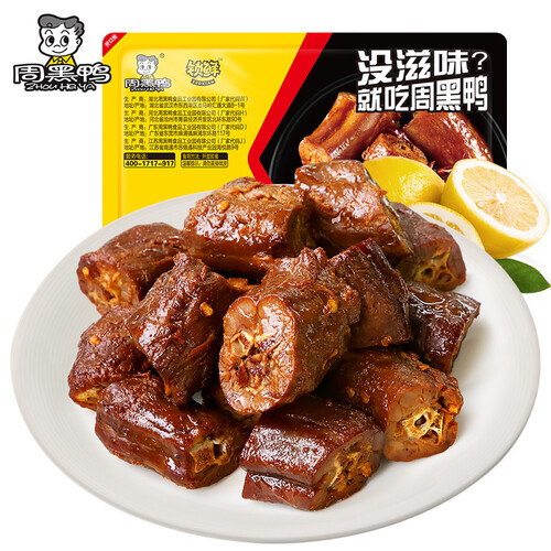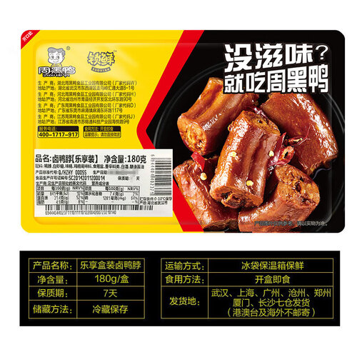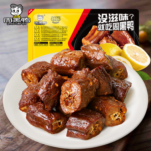 周黑鸭精选大鸭脖,根根肉多紧实,采用秘制卤料,香到骨头,入口微辣越嚼越辣,越辣越麻,越麻越香。