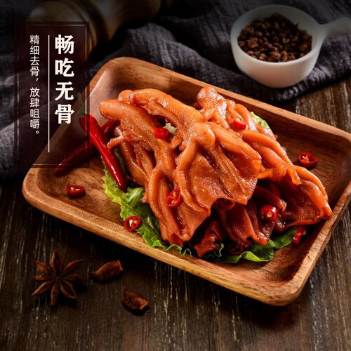 细选瘦肉型樱桃谷鸭,经多道工序卤煮,肉多鲜嫩味道可口。鸭掌经过去骨,麻辣香浓一口一个,食之更加香爽过瘾。