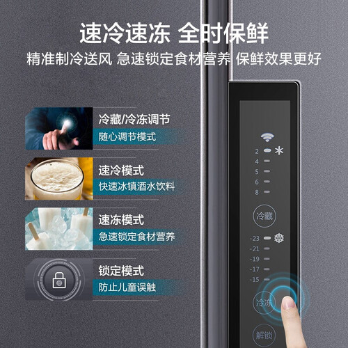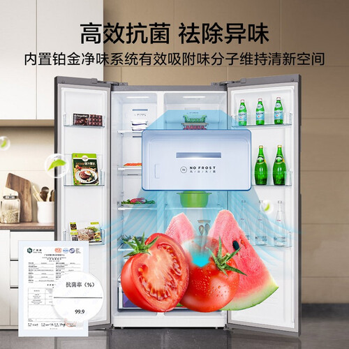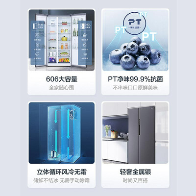 606L大容量,分区存储不同食材,不串味;变频风机和压缩机,减小箱内温度波动,持久保持食材新鲜;铂金净味设计,长效净化无异味。