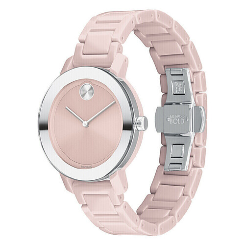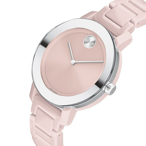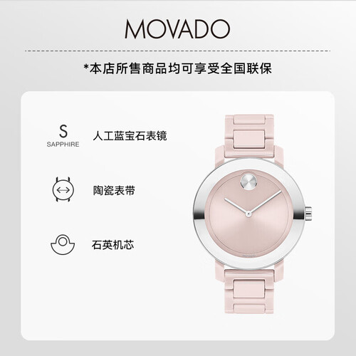 清新樱粉色表盘,搭配细腻光泽的精钢抛光表圈,柔美简约。采用人工合成蓝宝石玻璃表镜,透亮清晰,读时便捷。