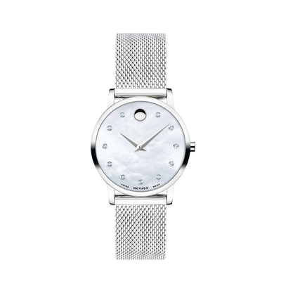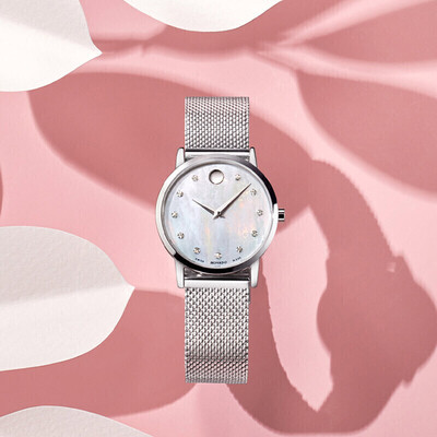 甄选优质的白色珍珠贝母精细打磨成表盘,莹亮时尚又环保。搭配银色双指针,像两把剑,锋芒毕现,有一种难以忽略的美。
