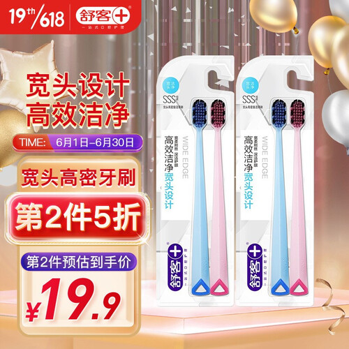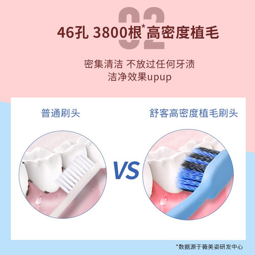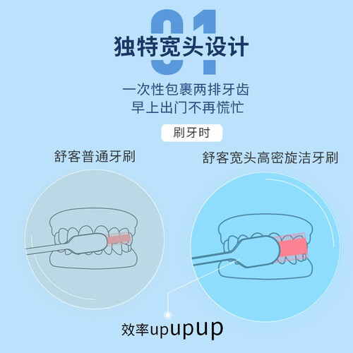 独特宽刷头设计,提高刷牙效率;高密度植毛,密集清洁,深入清洁齿缝;双螺旋刷丝,增大摩擦力,去渍更有效率。