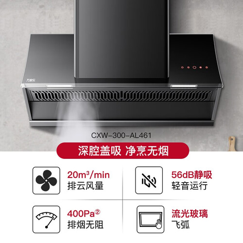 采用加深拢烟屏,牢牢锁住油烟防止外溢,保持厨房空气清新。加大离心涡轮,高速运转营造大风量,排烟更顺畅。