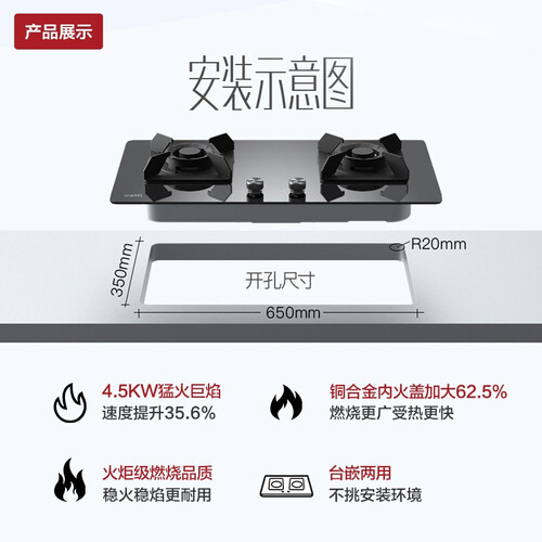钢化玻璃材质的台面,光滑易清洁,耐高温防爆裂。台嵌两用式结构设计,应对不同家居环境的安装需求,解锁多种场景。