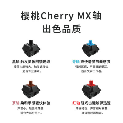 键帽采用PBT材质,耐磨防打油,充分发挥Cherry轴手感优势。搭载加厚PBT材质键帽,手感稳定,不易打油。