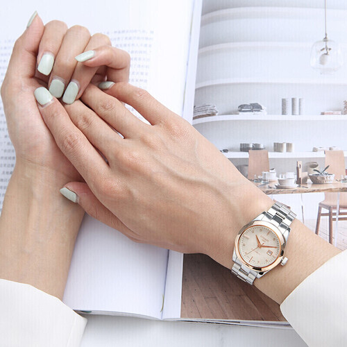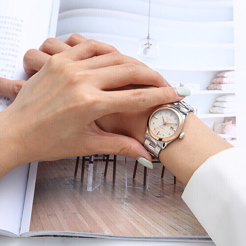 透底的表背设计,内部运行一览无遗,清晰感受机械韵律美感。象牙色表盘温婉细腻,点缀8颗钻石刻度,闪耀读时。