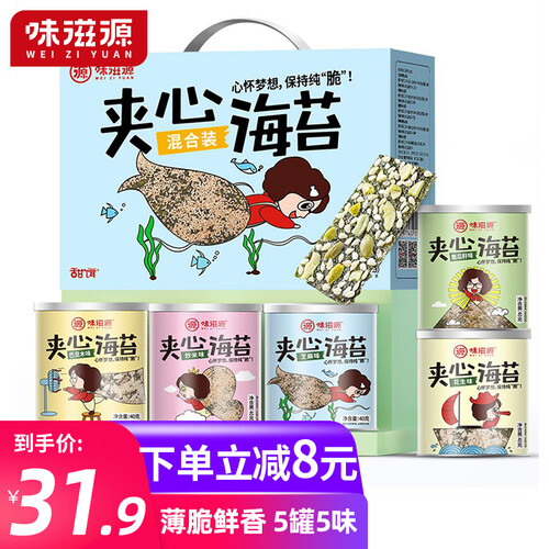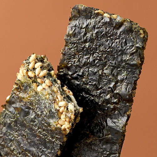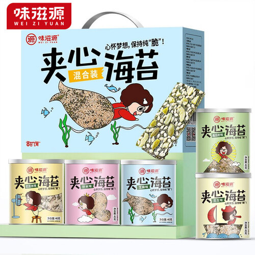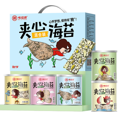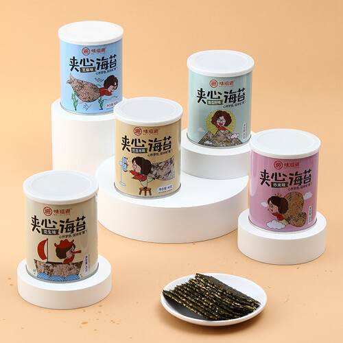 这款海苔夹心脆甄选优质紫菜搭配饱满新鲜坚果果仁为夹心,吃起来每一口都能感受到浓浓清新的海洋风味。