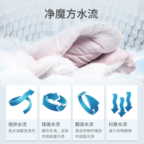 净魔方水流,四重水流360度洁净衣物,减少衣物缠绕,有效降低磨损。24小时预约,到点自动运行,晾晒无需等待,节省时间。