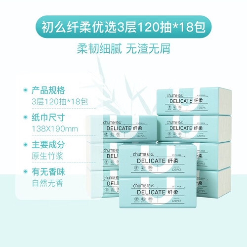 纸巾触感柔软细腻,擦在肌肤上很舒服,不会有粗糙的摩擦感。提取有机竹林精粹,不添加漂白剂,天然的,更健康。