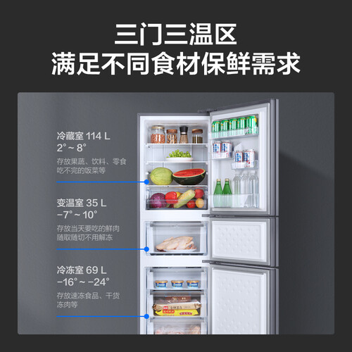 不同食材的保鲜温度不同,这款冰箱拥有便捷的三门三温设计,不同食材各有应对,并且还有超大变温室,宽幅变温,呵护多样食材。
