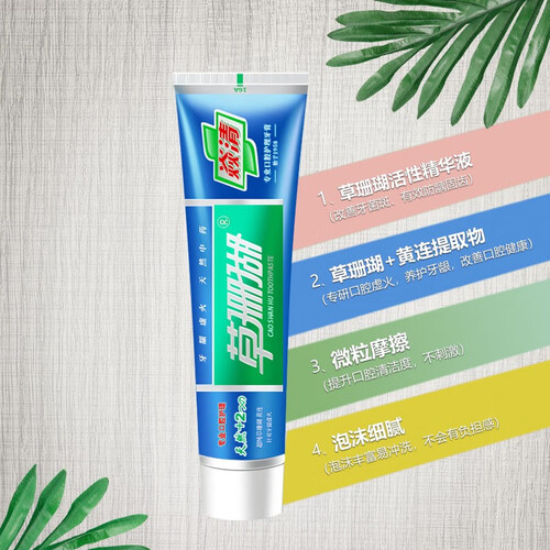 黄连提取物+高纯度草珊瑚精华,清热去火、强健牙齿、养护牙周,多重薄荷精华让口气持久清爽,绿色膏体满载精华,尽显清新自然。