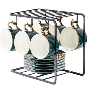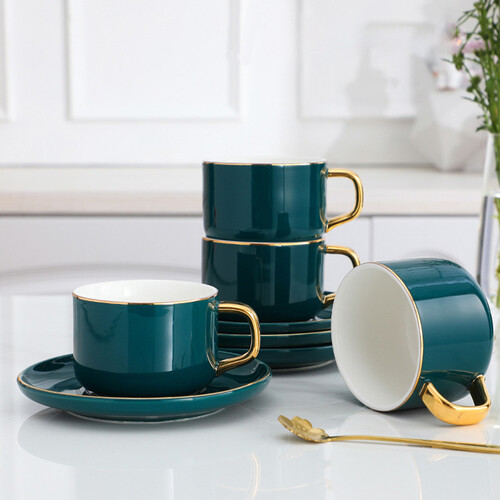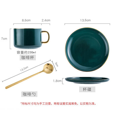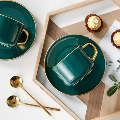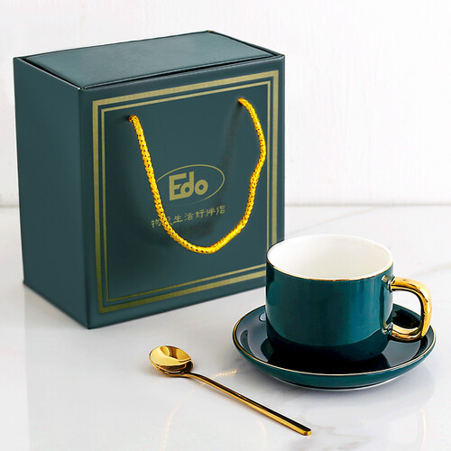 典雅墨绿色为主要基调,再以烫金加以装饰,轻奢复古。杯碟可放盛甜品容器,一物两用,性价比高。高温烧制,手感细腻。