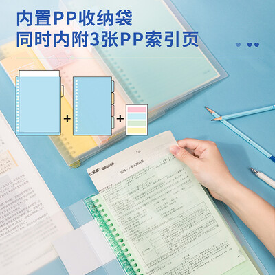内置式的PP收纳袋可以明确分类记录,整理收纳更轻松。大容量的细腻纸张可以书写更多笔记,同时不怕渗透。