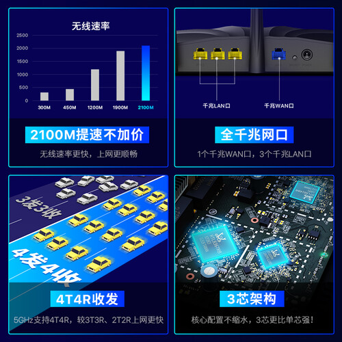 允许同时多终端共享5GHz信道,顺序变为多路同时收发,集成高性能三芯架构,多核驱动更稳,双频合一技术,智能完成频段切换。