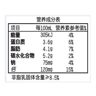 采用100%生牛乳加工而成,无任何添加剂,保留原生风味。每盒牛奶的钙含量高达228毫克,可以帮助补充钙质,让身体更强健。