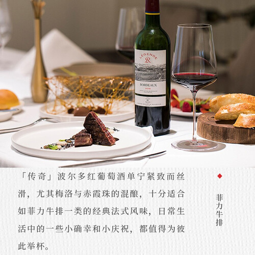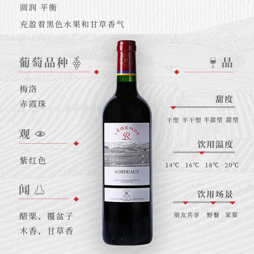 采用赤霞珠葡萄酿造,搭配上法国波尔多天然酿酒气候,使其酒香浓郁协调,酒质红亮。口感甘醇清新,入喉绵柔丝滑。