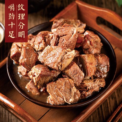 优选可溯源的鲜嫩牛后腿肉为原料,配以数十种香辛料精心烹调而成,牛肉嚼劲十足、汤汁醇厚,口感不油腻也不干柴。