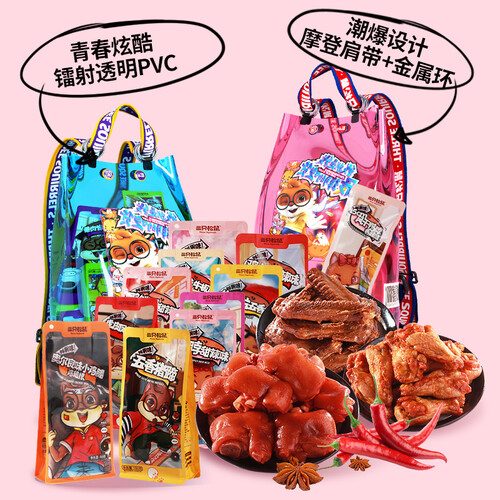 背包炫酷潮流,配合超透材质金属圆环,便捷携带时尚好看。多种风味肉食,香脆酥辣口感入味,放开吃玩尽兴。