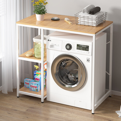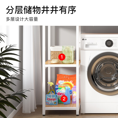 底部妥妥地安置洗衣机,顶部置物,解决杂乱无章,清新整洁。符合力学的板材钢架,能够有效支撑柜体,稳固结实。