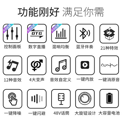 拥有21种控场特效,轻松直播,掌握全场气氛,带来出色直播效果。USB专业声卡打造,内置DSP降噪芯片,声音更为真实。