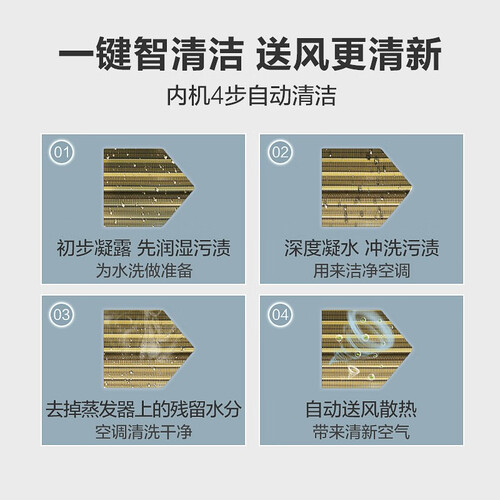 细高齿大螺旋角内螺纹管,增大的换热面积,提高换热效率。一键智清洁的功能,帮助冲洗内部灰尘污垢,送风更清新。