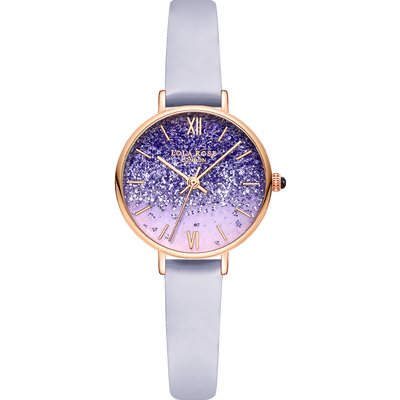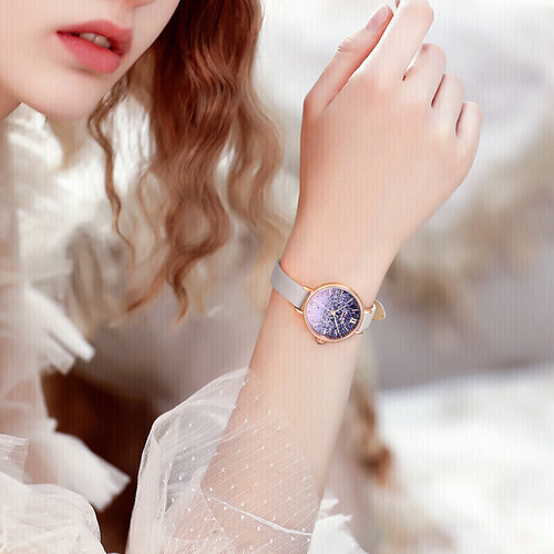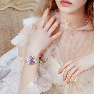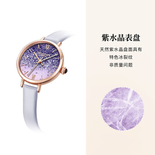 表盘采用紫色水晶装饰,渐变色彩丰富了视觉的看点,浪漫梦幻。矿物强化玻璃材质镜面,耐磨防刮花,日常磕碰不留痕迹。
