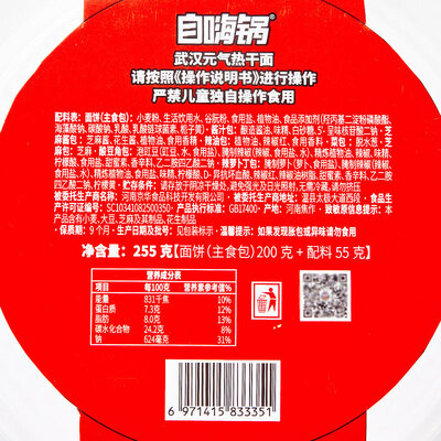 这款自嗨锅武汉热干面,选用当季新鲜的小麦面粉作为原料,搭配浓香芝麻酱,口感绵密美味。
