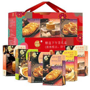 简洁喜庆红色礼盒,探亲访友提拎方便。内含椰蓉酥、鲍鱼酥和鸡仔饼等八种饼干零食,选用高端原料制作,吃出健康生活。