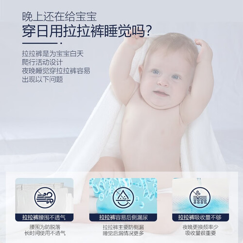贴身防勒,为宝宝量身定制的专属尺码,舒服又不紧绷。吸收量增加百分之30,加强吸收锁水的力量,安心舒睡一整夜。