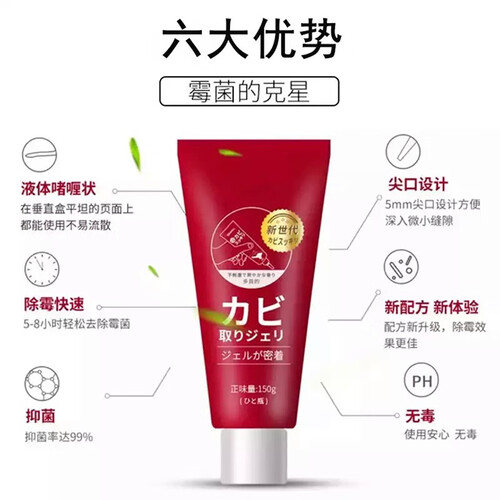 此款呈液体啫喱状,不易流散,在平坦的基面上也能使用;采用渗透性设计,5至8小时轻松除霉,防护效果更持久。