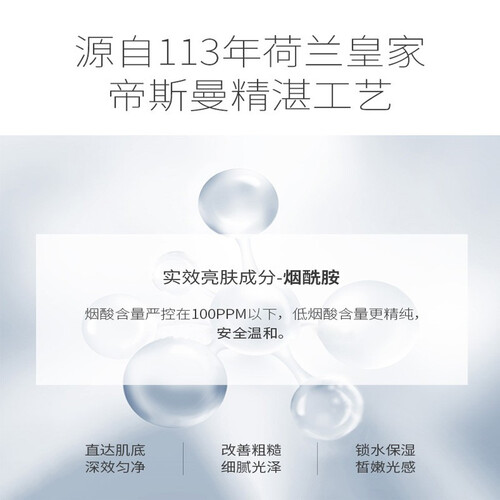 含有烟酰胺亮白成分,令其拥有良好的美白效果,坚持使用,可以有效改善肌肤暗沉、粗糙等问题,匀亮肤色。