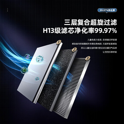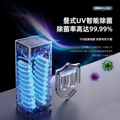 具有紫外线除菌功能,可以有效杀除室内的细菌,维持健康的环境。采用斜流风机设计,增大出风量,空气净化效率更高。
