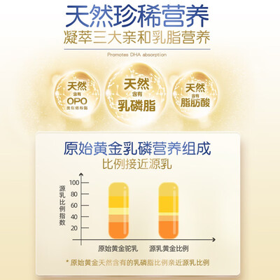 拥有天然牧场的黄金奶源,三大亲和珍稀营养,促进DHA吸收。亲近原乳的比例,帮助宝宝补充多维营养元素。