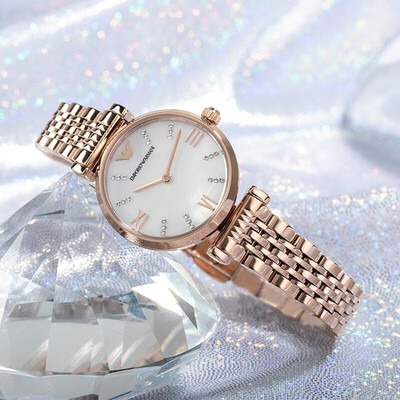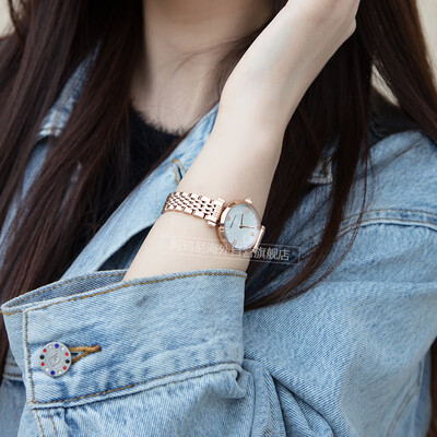 表盘采用水钻,搭载罗马数字时间刻度,清晰明了,富有层次感,简约时尚。金色钢制而成的表带,光泽温润,易于日常佩戴穿搭。
