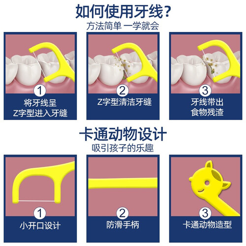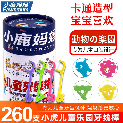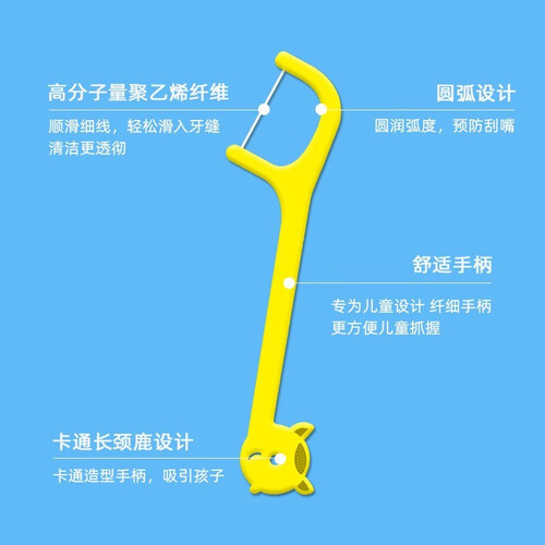 专为2岁以上的儿童设计,小头细线入口不伤宝宝娇嫩牙龈,4种颜色4种萌趣动物造型,让宝宝看了喜欢妈妈放心剔牙。