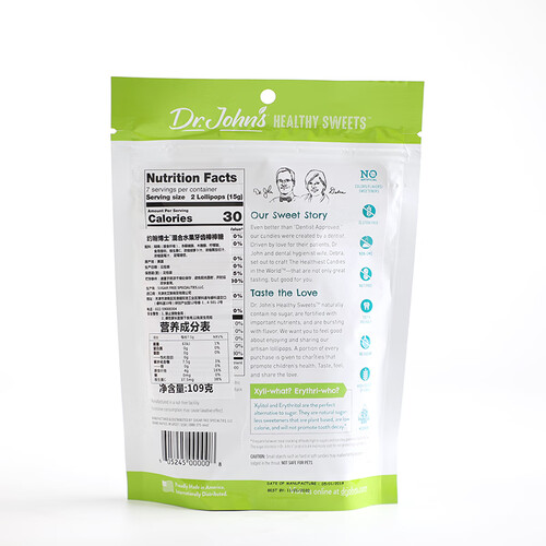 约翰博士无糖棒棒糖,包含纤维、木糖醇和各种水果口味的浓缩汁,成分简单,大人、小孩、孕妇都可以吃。不甜腻,口腔更健康。