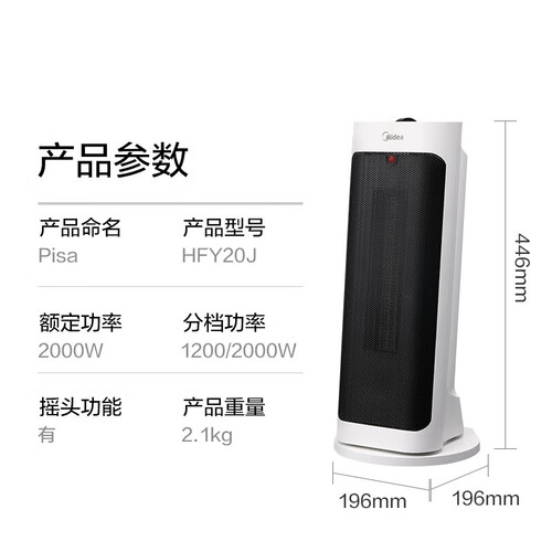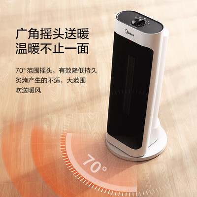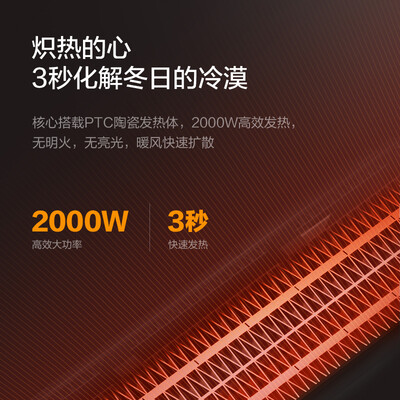 搭载PTC陶瓷发热体,2000W大功率,速热取暖由内而外。70°广角摇头送暖,提升取暖舒适感,次日醒来皮肤不觉干燥。