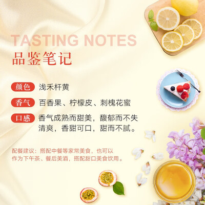 淡黄色的酒液色泽,散发着百香果与柠檬皮还有刺槐花蜜的气息。香甜清爽的口感,香气馥郁,唇齿间弥漫着优雅的花果香味。