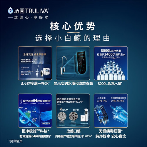 2.5升/分钟急速水流,一杯好水无需久等。有效滤除64种有害物质,保障喝水健康。长效RO反渗透滤芯,三年才更换一次,省钱省力。