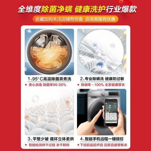 内置快舒省蒸汽烘干程序,即洗即穿,解决着急出门烦恼。搭载健康除螨洗技术,保护宝宝娇嫩的肌肤,为你带来更好的使用体验。