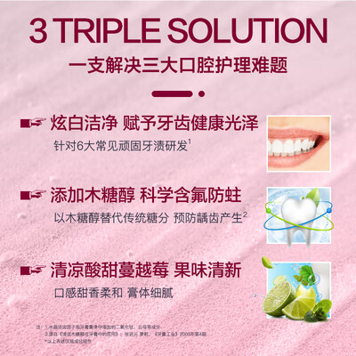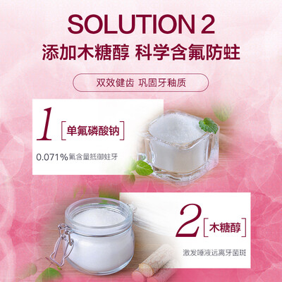 精选复合滋养成分,能增添口腔活力,让牙齿安心享受美味大餐;蕴含木糖醇和单氟磷酸钠双重健齿精华,可远离牙菌斑。