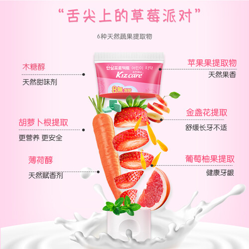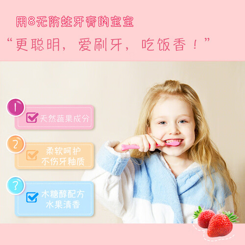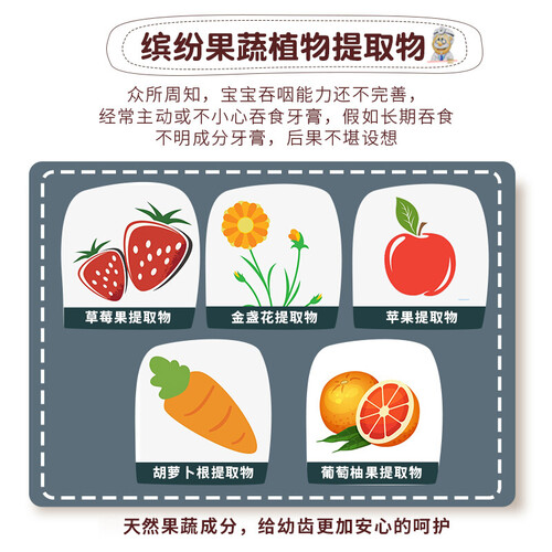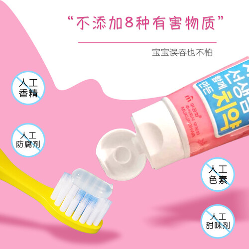 无氟配方,拥有清甜果味,宝宝更容易接受。添加八大果蔬提取物,不担心吞咽的危险,温和呵护宝宝牙齿健康。
