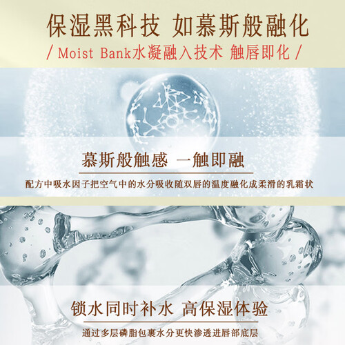 添加吸水因子,充分补充唇部所缺水分,令双唇更饱满。蕴含蕴含多层磷脂成分,锁住水分且滋养性佳能够减淡唇纹,抚平唇部细纹。