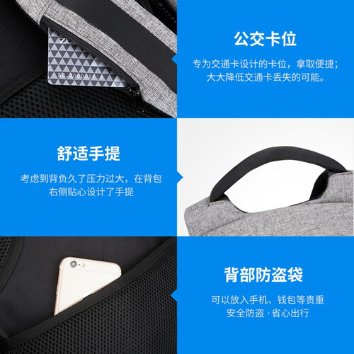 具有防盗功能的一款背包,曲面全包裹设计,夜晚出行无担忧。符合人体工程学设计的S型肩带,舒适不压肩,缓解多重压力。